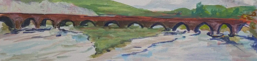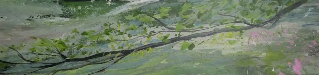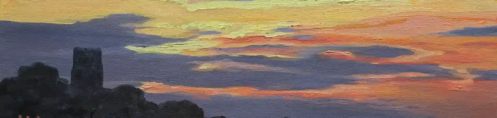 I start by soaking in the atmosphere. I note where the light is coming from, and what shapes and colours I can see. I also see what I want in my composition. Then I set up my easel. I decide if its ‘landscape’ or ‘portrait’ , get my palette and decide which colours I want to start with. My brushes also hang alongside and my water carrier is in place.